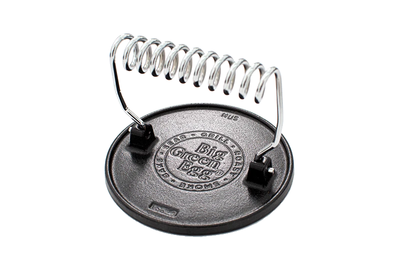 De Grill Press van Big Green Egg is gemaakt van gietijzer. Gebruik de pers voor het aandrukken van hamburgers of andere stukken vlees of groenten op de barbecue.