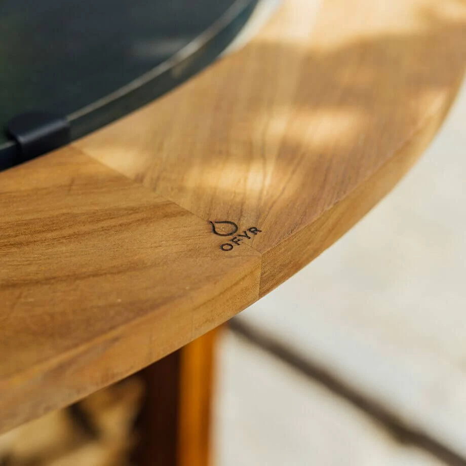De OFYR Fireguard Ring 85 een teakhouten bescherming voor om de bakplaat van de OFYR. De drie losse elementen worden bevestigd met behulp van 6 stalen beugels die zwart gecoat zijn. De totale buitendiameter van de Fireguard is 111 cm en de ring is 2,2 cm dik. Naast bescherming dient de 12,5 cm brede ring als tafel voor kleine gerechten, een peper- en zoutmolen of een biertje.Â